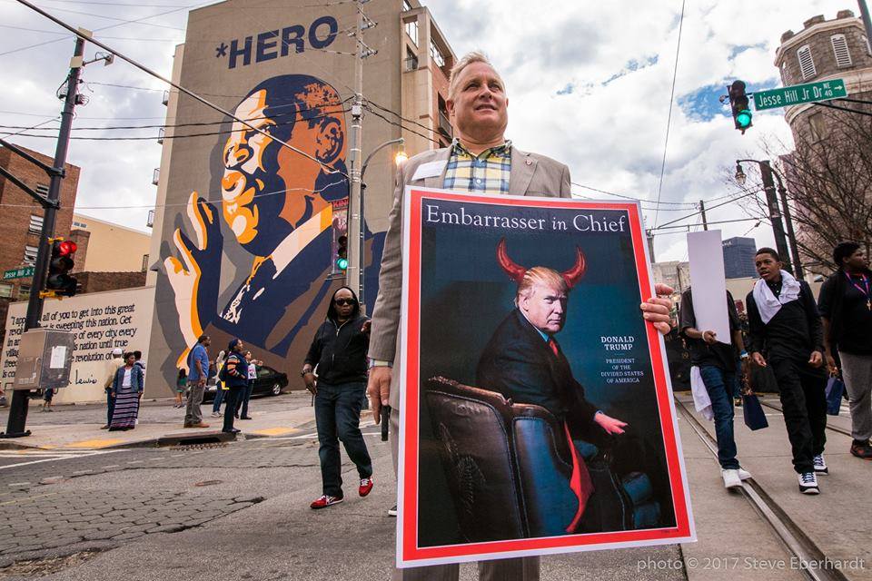 As the march from Freedom Park through lovely historic Atlanta neighborhoods approached its end that sunny afternoon, my friend Cebo and I decided to celebrate the camaraderie and hopeful optimism of the day with a beer and a burger at the Vortex. Waiting on the deck for our table, a blond woman from the suburbs or Dalton or anywhere but here looked at my Embarasser In Chief sign, Donald Trump emblazoned with Satan’s horns, and admonished me, “You need to show respect for the president!”